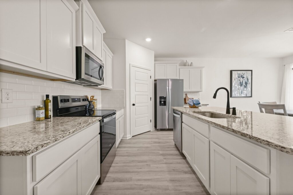 Open concept floor plan, large island in kitchen with granite countertops, soft close cabinets, stainless steel appliances, split floor plan