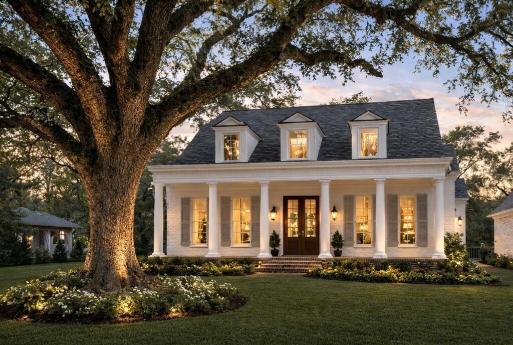 This beautiful Southern traditional home was built by LeBlanc & Fresina Builders, designed by renowned architect Lionel F. Bailey, AIA, with interiors by A Lewis Designs. Nestled beneath the canopy of a large, mature live oak tree, the home makes a timeless first impression with its symmetrical facade, classic dormers, and welcoming front porch framed by tapered perma cast columns.