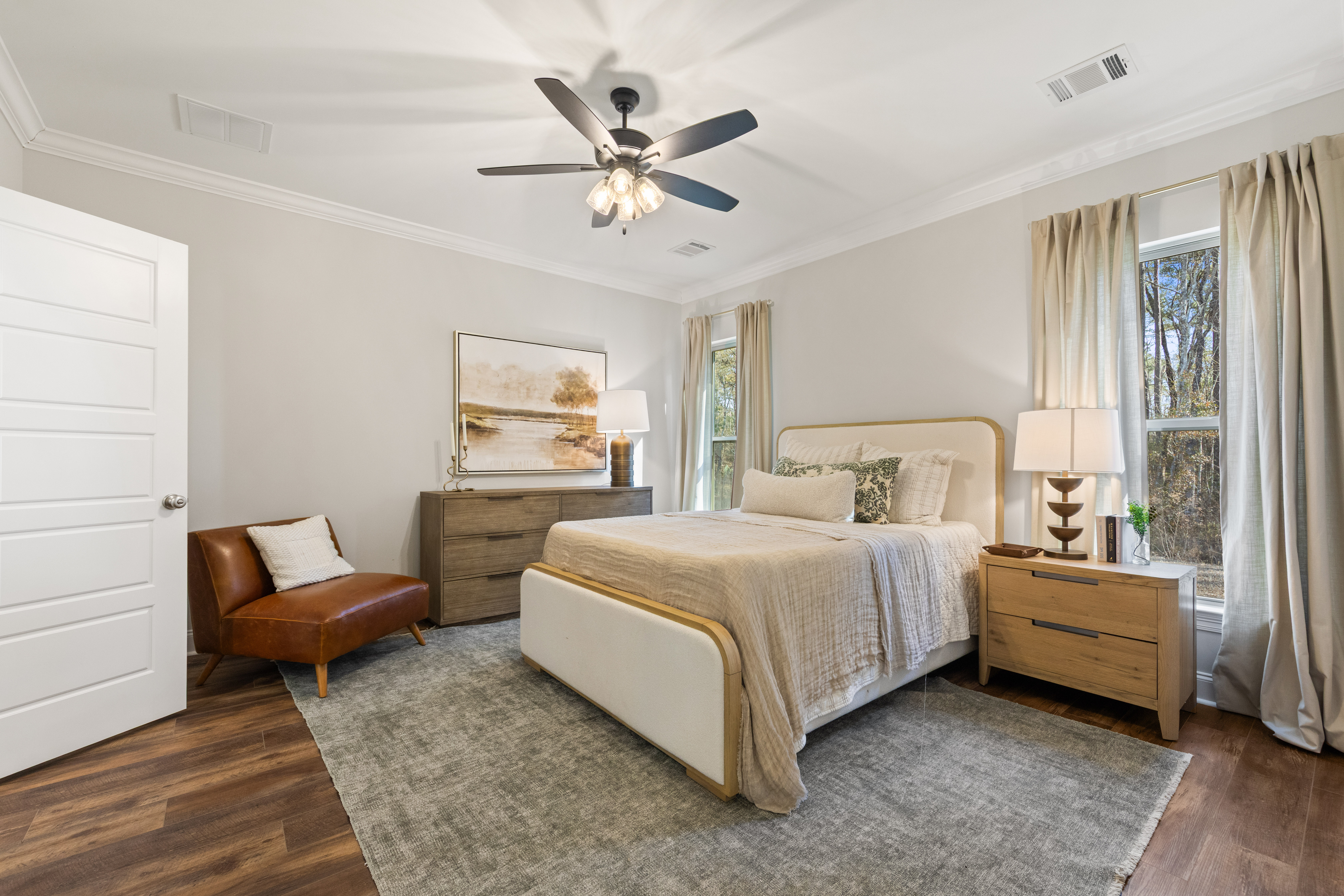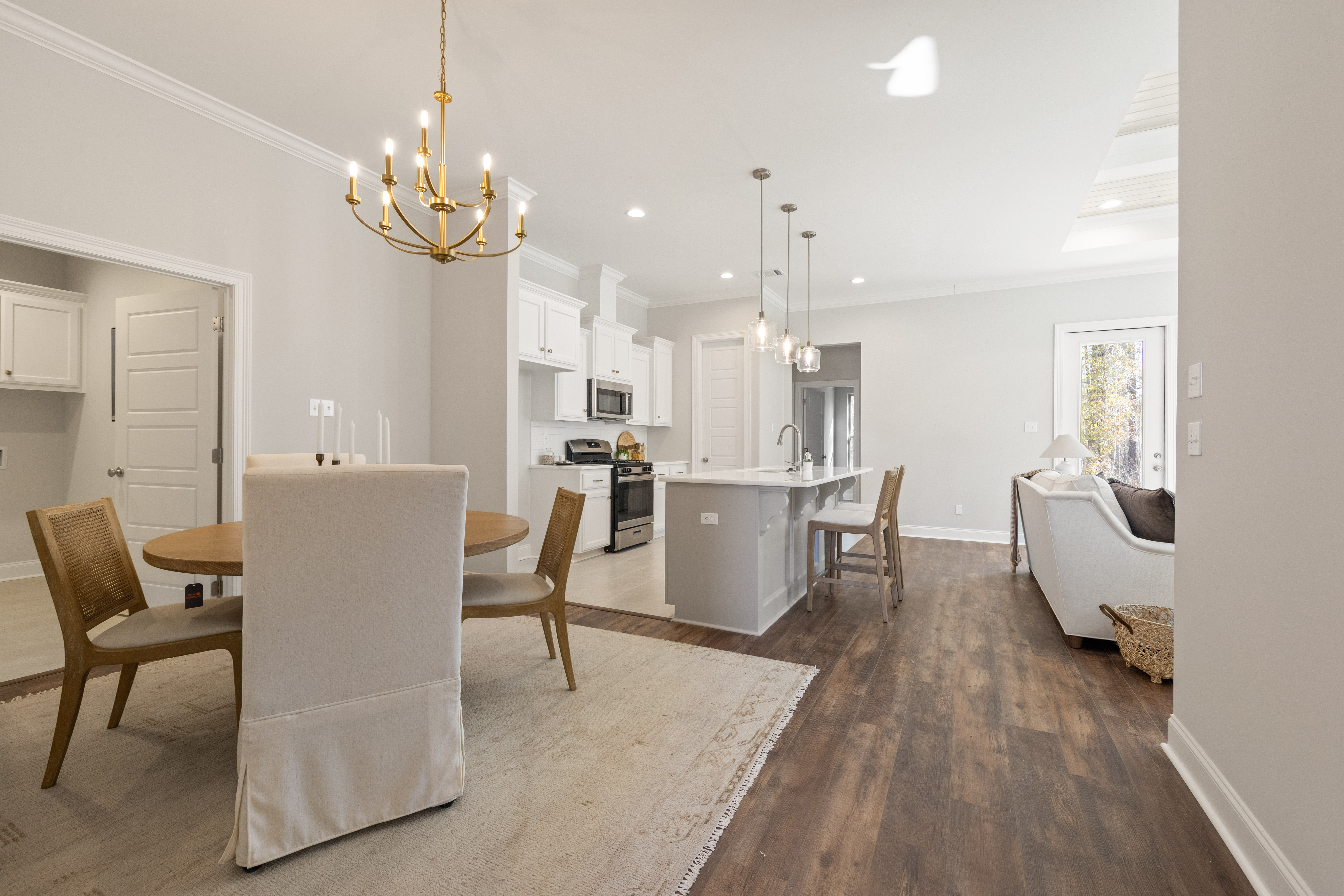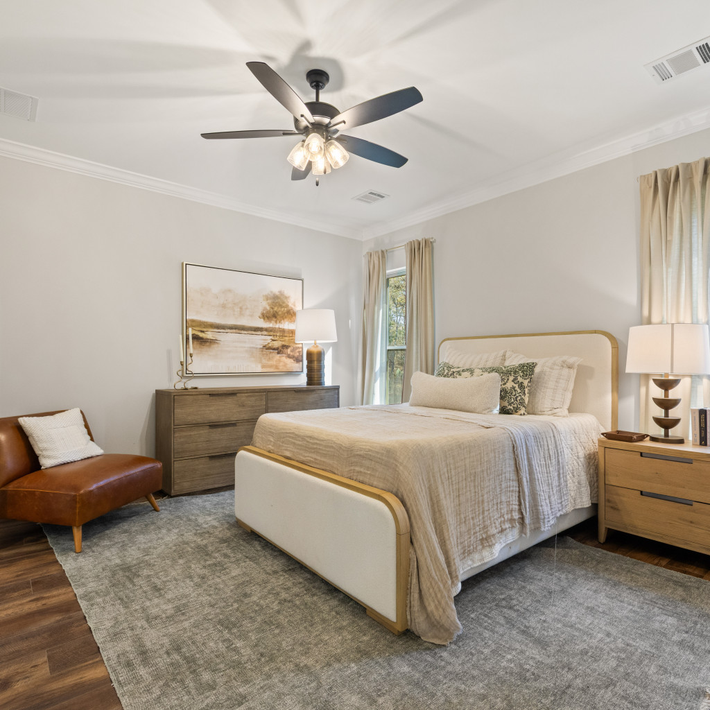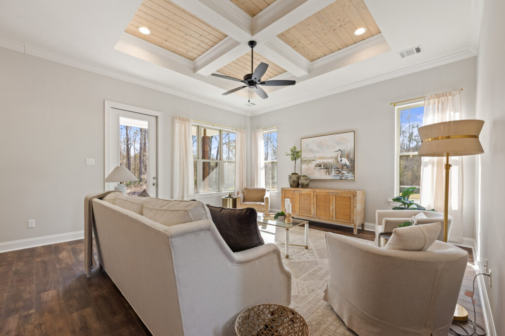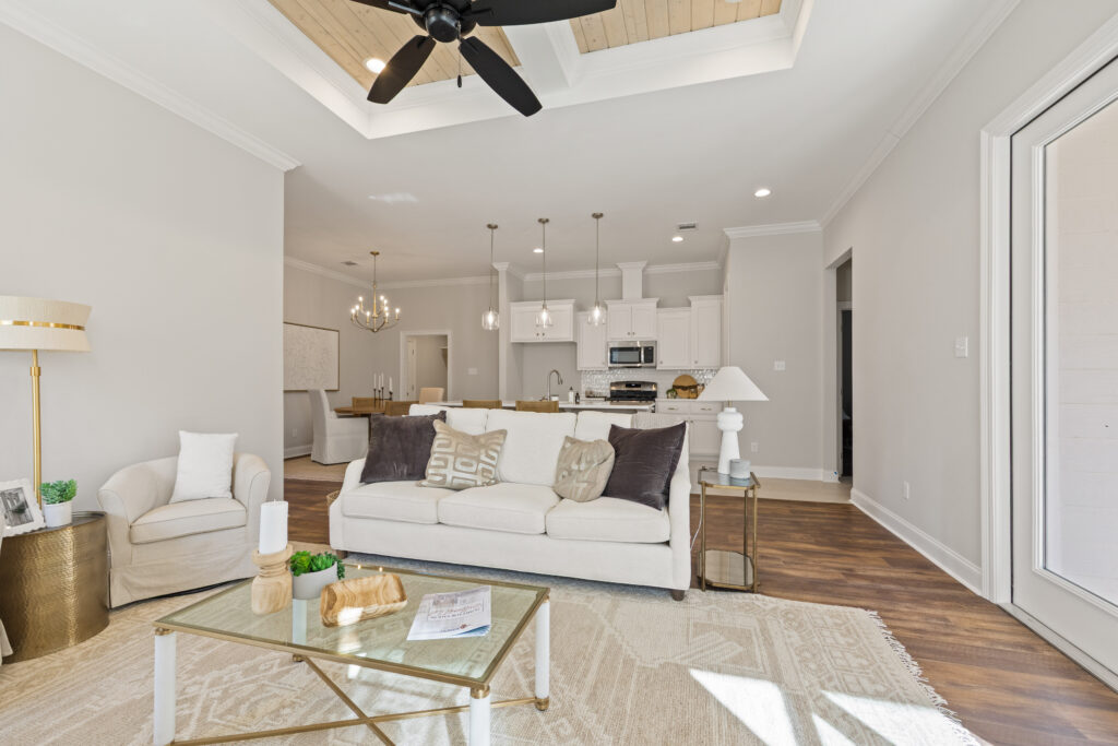 Functional open split layout with 4 bedrooms and 2 full baths, highlighted by a stunning tongue-and-groove coffered tray ceiling with gypsum beams in the living area. The chef-inspired kitchen includes a spacious island with pendant lighting, GE stainless steel appliances, a gas range, 3cm granite countertops, custom cabinetry, and a walk-in pantry.