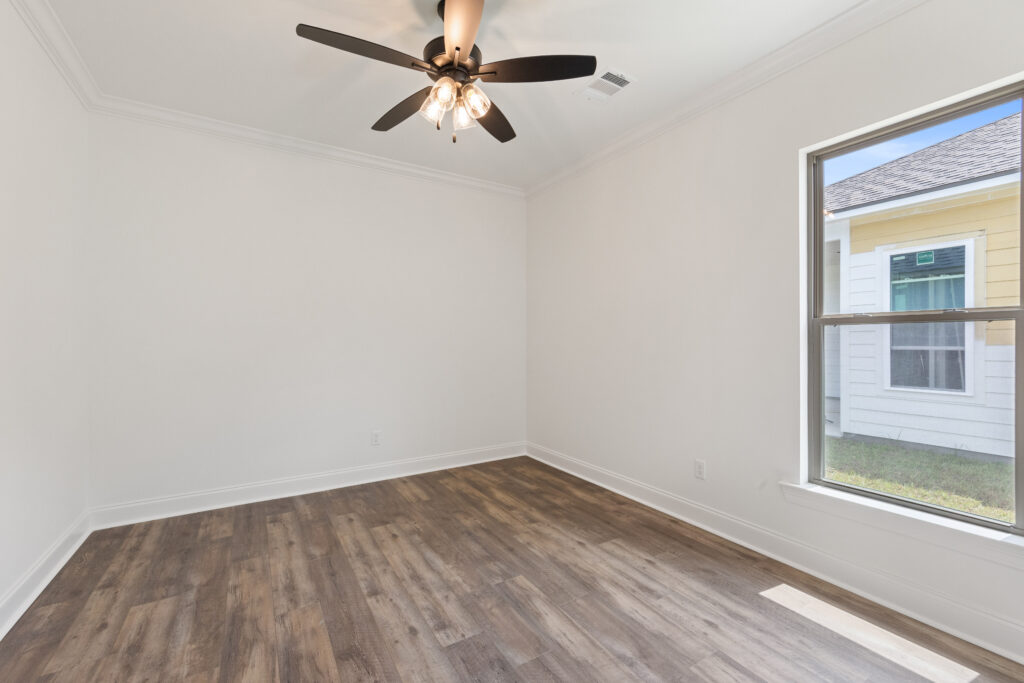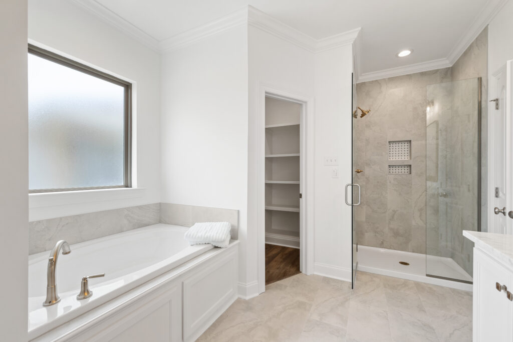 Interior finishes include luxury vinyl plank flooring in living spaces, tile in wet areas, and plush carpeting in the secondary bedrooms. The master bathroom is a spa-like retreat, complete with a custom-tiled shower featuring a fiberglass base, frameless glass door, and high-end finishes.