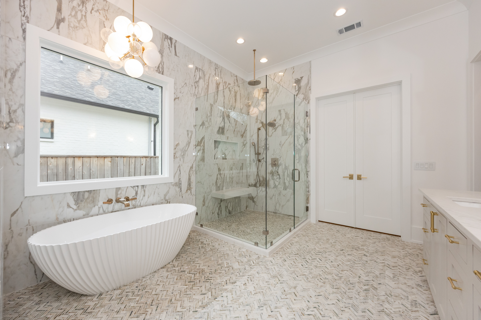 Shiplap ceiling and marble accents